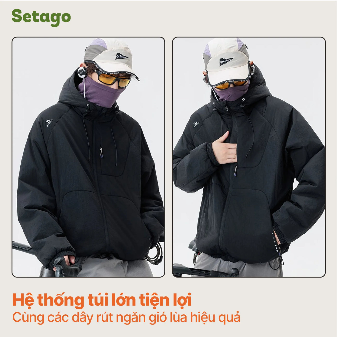 Hệ thống ngăn gió thông minh: Áo được trang bị các dây rút tùy chỉnh tại mũ và gấu áo, kết hợp với cổ tay bo chun để ngăn chặn hoàn toàn những luồng gió lùa, giữ cho nhiệt độ cơ thể luôn ở mức cân bằng.