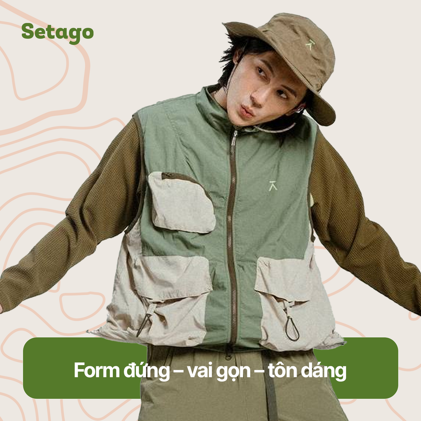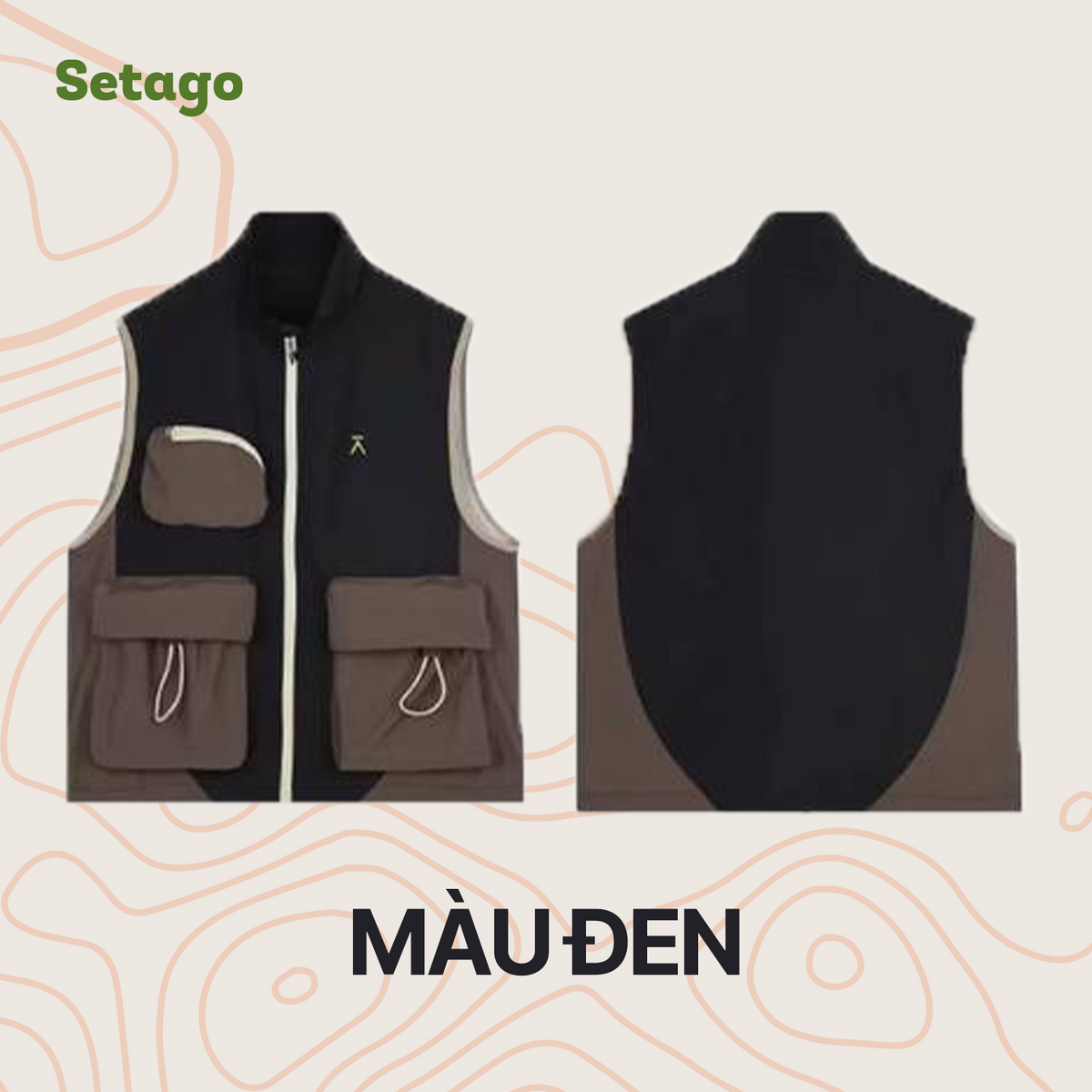 - Túi: 1 túi ngực, 2 túi hộp bên bụng có nắp + khóa kéo; bên trong túi có ngăn nhỏ chứa thẻ/tiền xu.