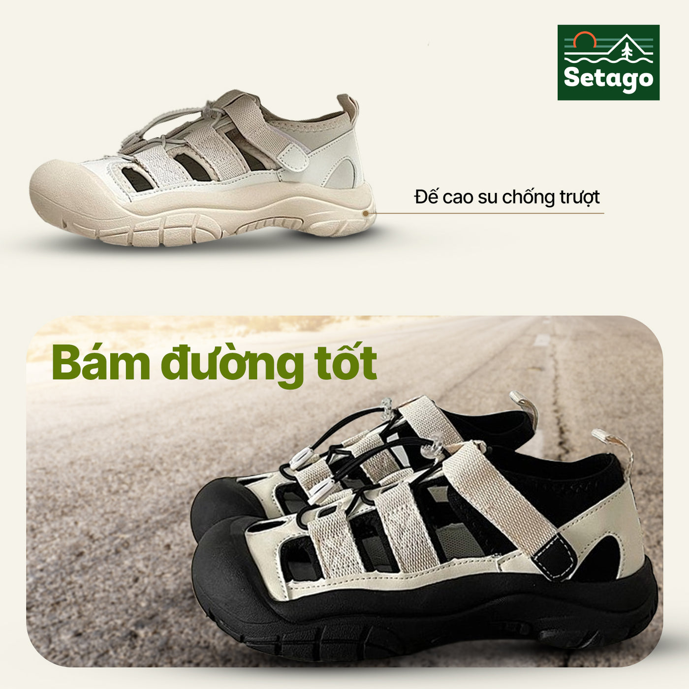 hần đế được thiết kế với rãnh gai chống trượt, tăng độ bám trên nhiều bề mặt khác nhau – từ đường phố, vỉa hè ẩm ướt đến các địa hình nhẹ như đường mòn, suối cạn. Độ cao đế 3.5cm còn giúp giảm chấn khi tiếp đất, êm chân hơn khi đi bộ lâu.